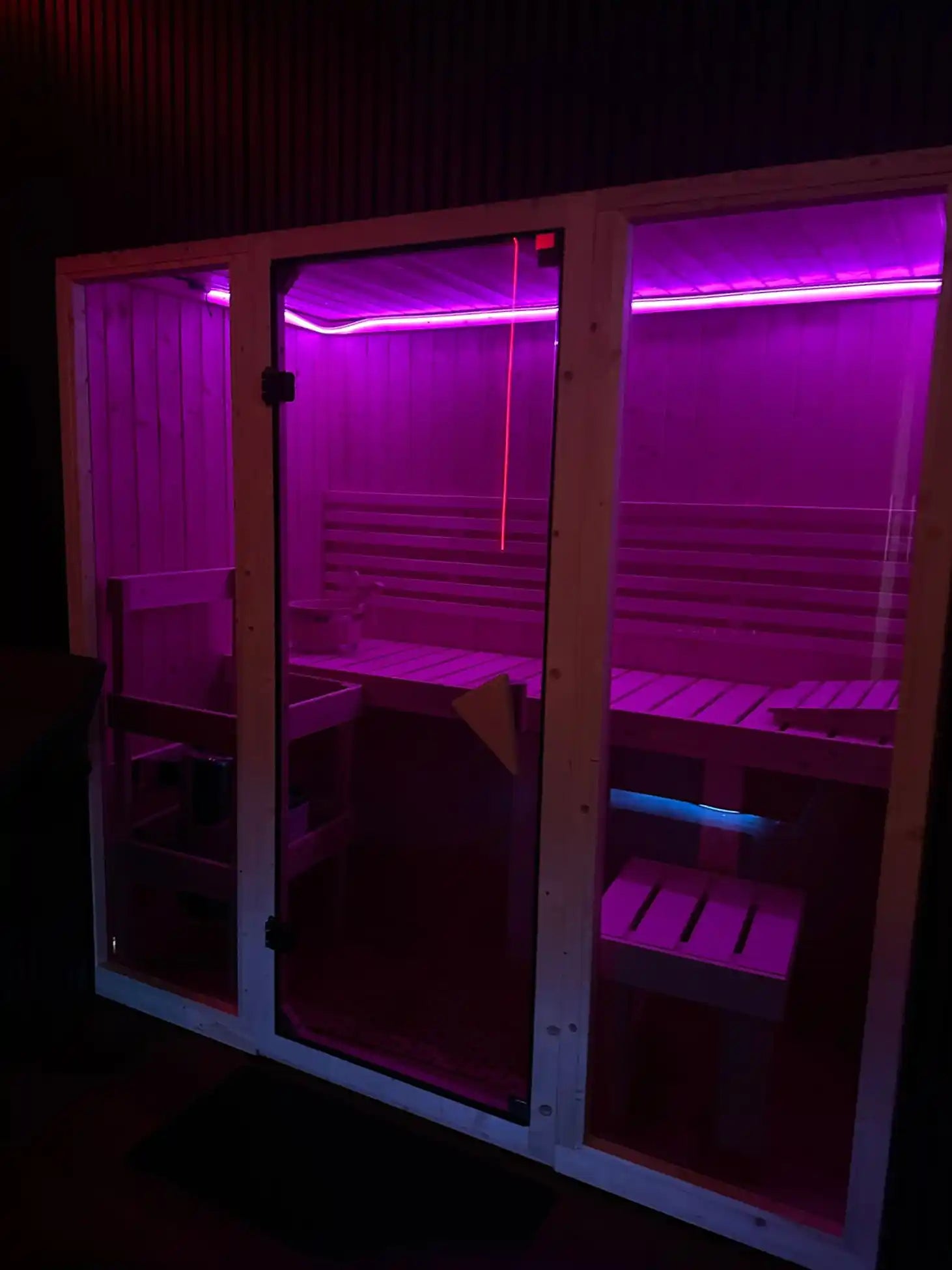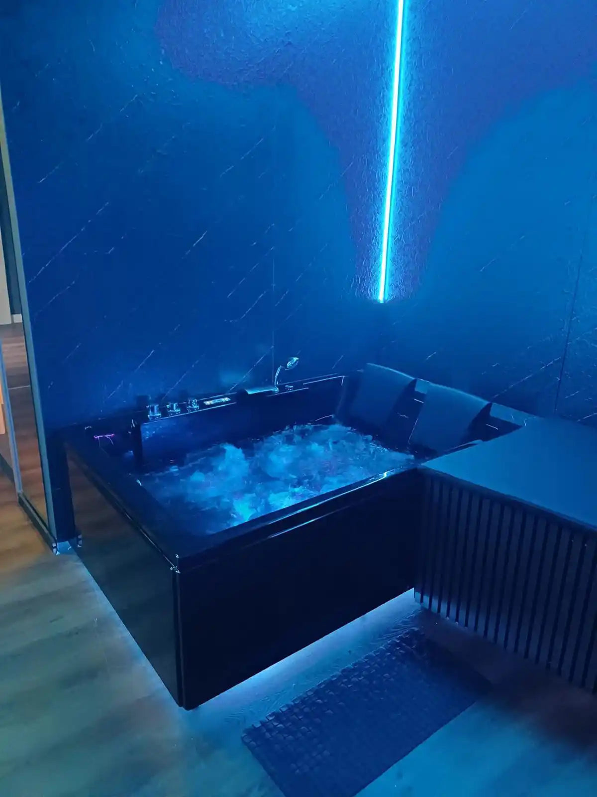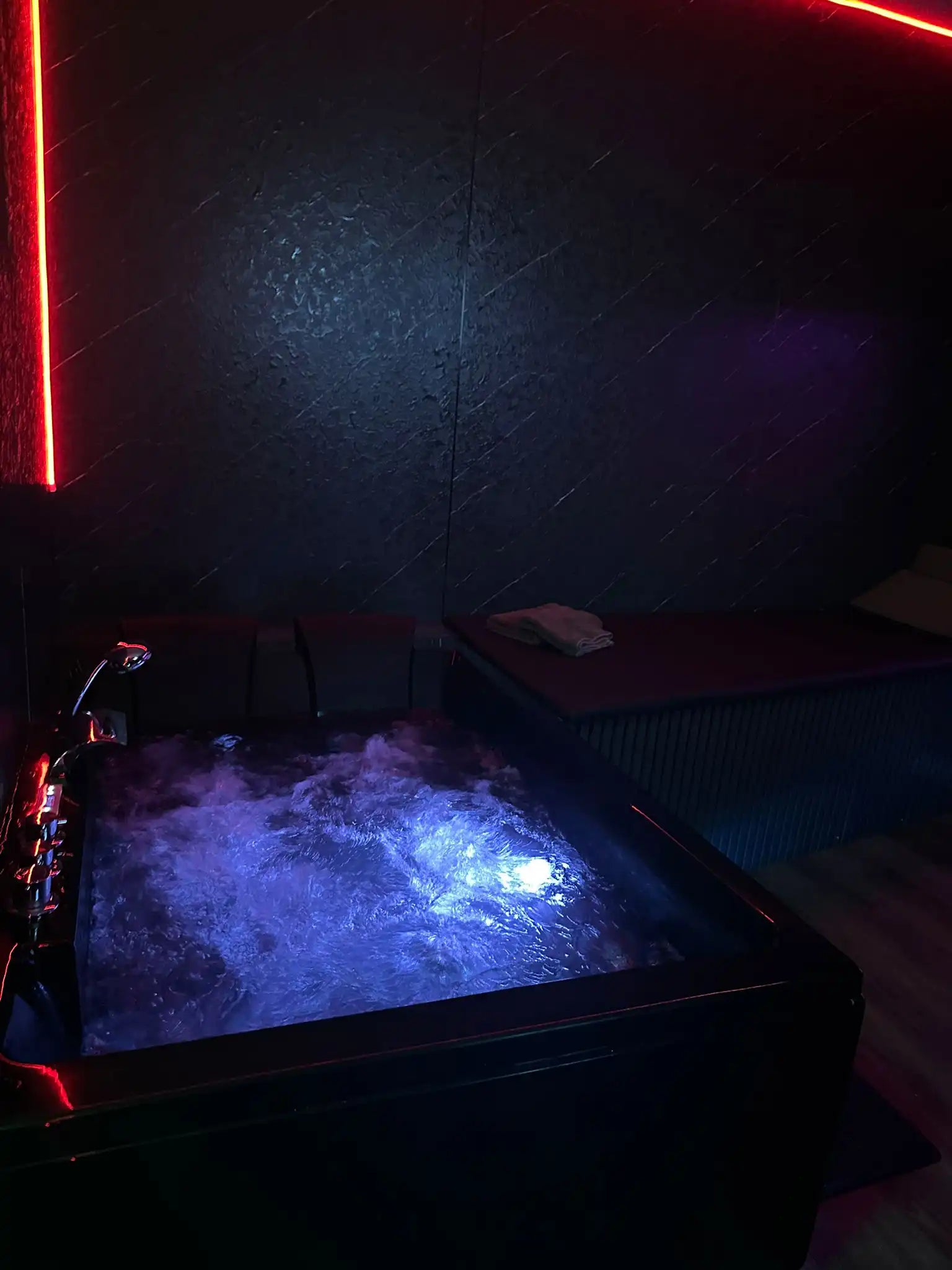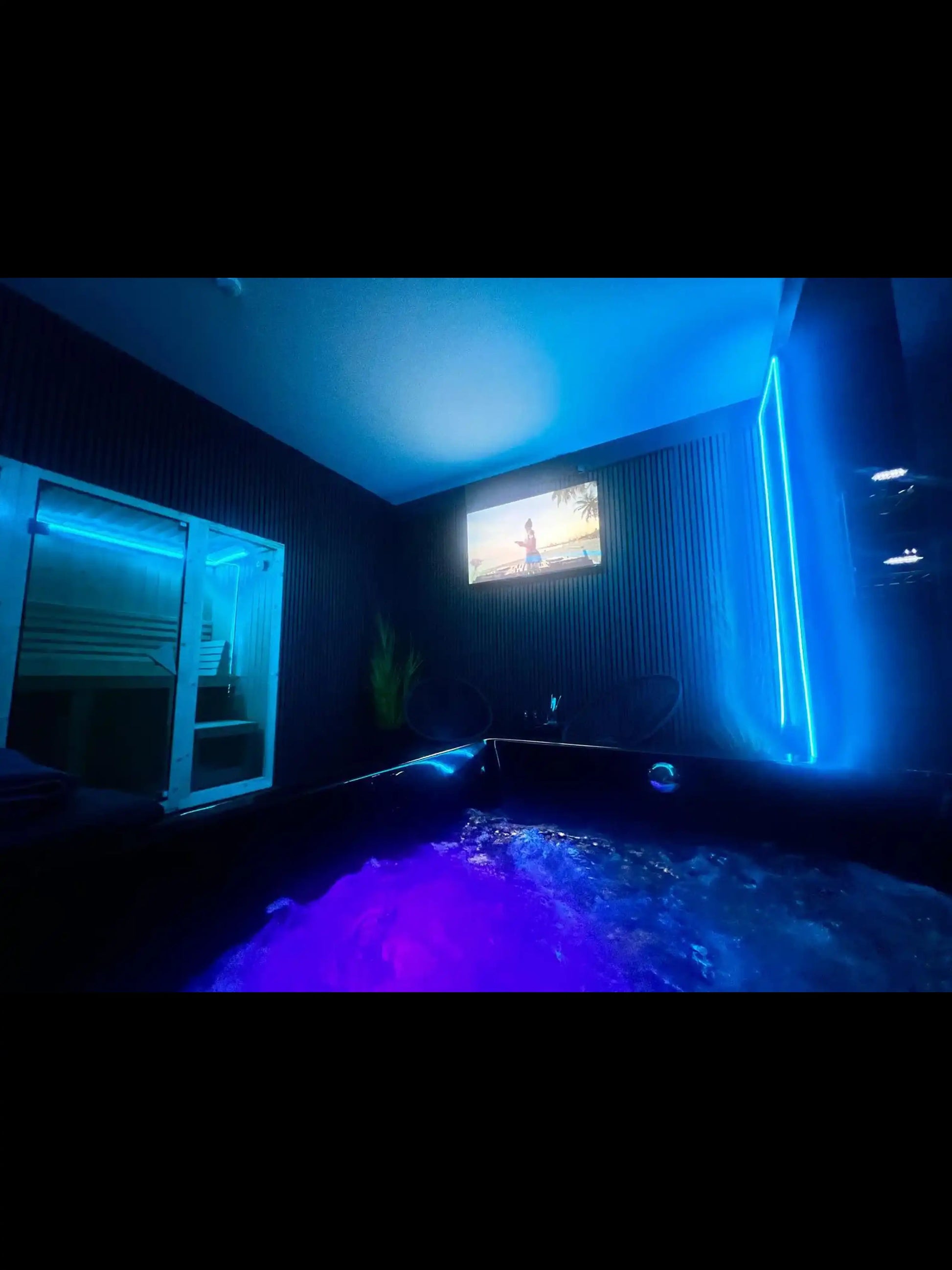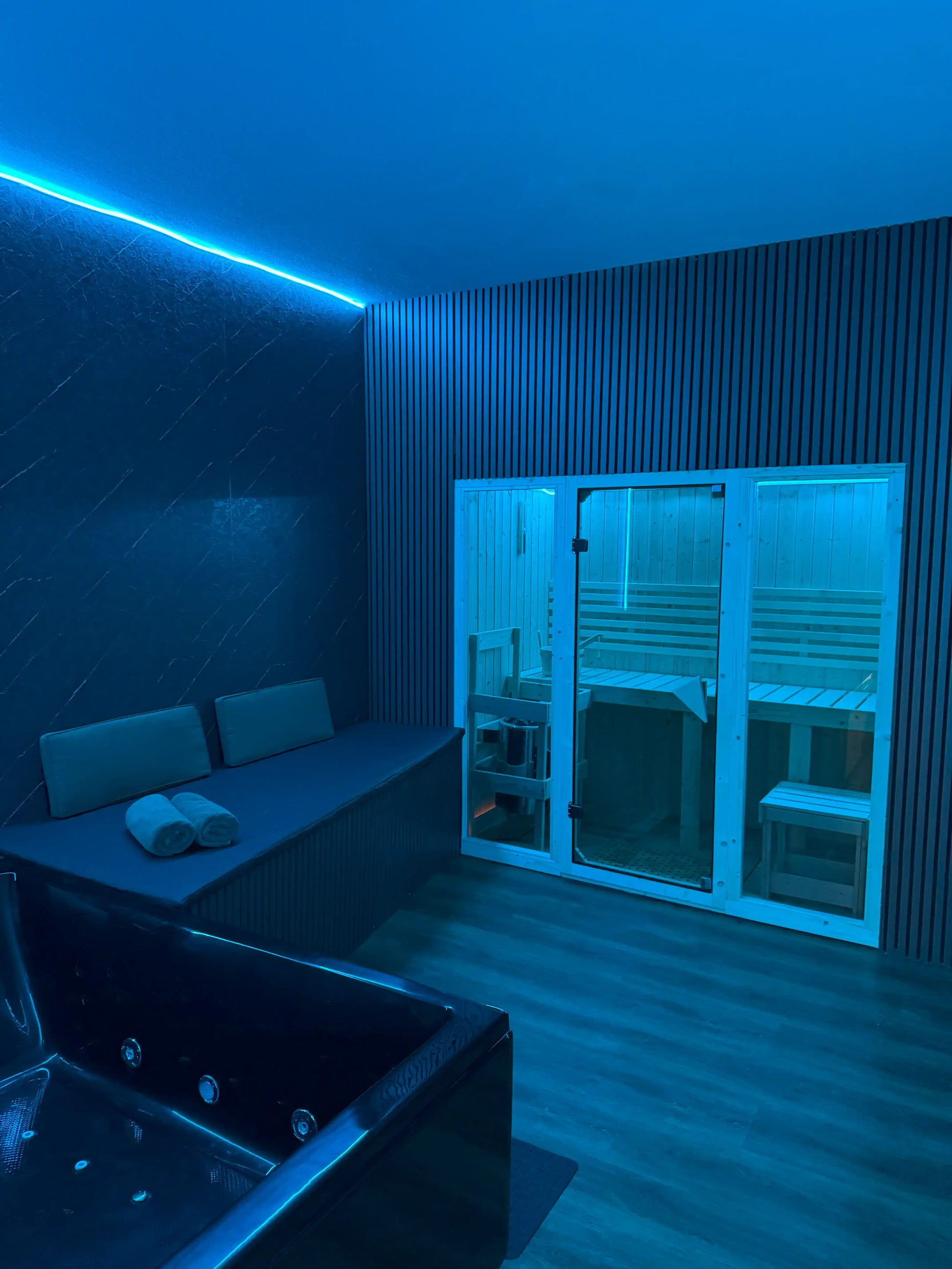 Typisches Setup: Whirlpool, Sauna, Entertainmentsystem, Drinks, Eigenes WC mit Dusche, Handtücher, Duschgel & Shampoo